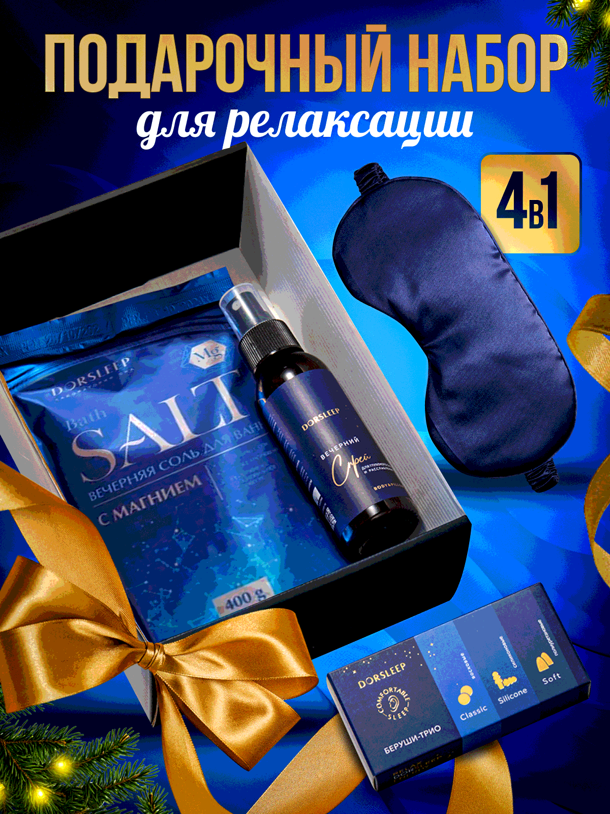 Подарочный набор Dorsleep Box – идеальный выбор для тех, кто ценит комфорт и расслабление. Этот набор станет прекрасным сюрпризом для друзей, родных или коллег Он включает в себя разнообразные элементы, созданные с учетом потребности в отдыхе и восстановлении сил Внутри набора вы найдете все необходимое для создания атмосферы уюта и спокойствия. Это поможет сделать вечер более приятным после долгого рабочего дня или станет отличным дополнением к выходным. Спрей с ароматом лаванды на основе натурального эфирного масла лаванды помогает расслабиться, легкий аромат обеспечивает засыпание и соблюдение качества сна. Нежная маска из 100% шелка обеспечивает комфорт и бережное отношение к коже. Блокирует свет, создавая идеальные условия для отдыха. Набор из 3 пар берушей для каждого случая и уровня комфорта. Выберите свой идеальный вариант и наслаждайтесь тишиной. Подарочный набор для сна – Это ритуал заботы о себе, который подарит здоровье, спокойствие и здоровый сон